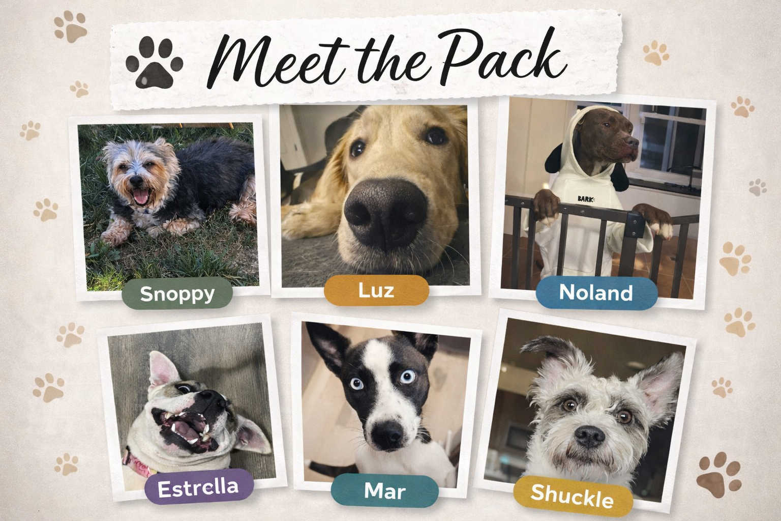 We're Karina and Joel, and our lives are centered around a whole lot of love... and a whole lot of canine chaos! Our family unit includes us and our incredible pack of six dogs: Snoopy, Shuckle (yes, like the Pokemon lol), Mar, Noland, Luz, and our baby girl, Estrella.